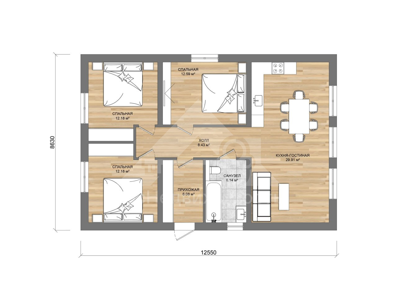 Номер объекта - 1540 Предлагаем к продаже проект 1-этажного дома 90. Участок входит в стоимость. Кадастровый номер участка - 33:04:062102:940 При наличном расчете действует скидка 10% Звоните ответим на все вопросы. Адрес: Владимирская область, Юрьев-Польский муниципальный округ, село Кумино Цена участка - 30тыс.руб. за сотку Комплектация дома "Базовая": В "Базовую" комплектацию дома входит полный закрытый теплый контур: • Несущие стены газобетон / теплая керамика • Утепленная кровля из металлочерепицы • Окна двухкамерные с тройным стеклопакетом • Металлическая входная дверь • Фундамент (в зависимости от участка) • Утепленная отмостка О доме: • Площадь дома: 90.00 м2 • Фундамент: Бетонный - готов к строительству дома • Кровля: Кликфальцевая • Подшивка свесов софитами • Фасад: штукатурка Короед Инфраструктура: • Водоснабжение: Есть в населенном пункте • Отопление: Нет • Газ: Есть в населенном пункте • Канализация: Нет • Электричество: Есть в населенном пункте В доме: • Кухня-гостиная: 29.91 м2 • Комнаты: 3, площадью 12,2-12,2-12,6 м2 • Санузел: Совмещенный в доме • Ванная: Стандартная • Мебель и бытовая техника при продаже — Без мебели. Расположение в доме: На 1 этаже расположено: Холл, Прихожая, Кухня-гостиная, 3 Спальни, Сан. Узел Об участке: • Площадь земельного участка: 13.35 соток • Форма: Прямоугольная • Рельеф участка: Ровный • Разрешенное использование: Для индивидуального жилищного строительства • Забор: Отсутствует • Границы участка: Уточнены • Земля: Не разработана • Дополнительные постройки на участке: Ничего Окружение: • Дорога к дому: Асфальт. Дорога в отличном состоянии • В зимнее время дом доступен • До ближайшей остановки общественного транспорта: менее 200 метров • В шаговой доступности следующие объекты: Остановка общественного транспорта, Лес, Водоем Если вас заинтересовал дом — обращайтесь за подробностями. Всегда рады помочь. Помощь в получении кэшбека при покупке недвижимости и ипотеки. Гарантируем безопасность сделки.